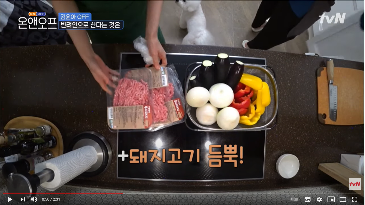 재료 : 양파 2개, 가지 2개, 파프리카 2개(노란색2개2개(노란색 2개, 빨간색2개), 돼지고기 다짐육 1팩(돼지고기가 듬뿍 들어가야 맛있다고 하니 진한 고기 맛을 원하시면 1팩반~21팩반~2팩도 가능하실 것 같습니다. 약 400g정도. 김윤아 님은 지금 재료의 2배 양에 돼지고기 다짐육을 3팩을 넣으셨습니다.), 시판 토마토소스 1/2통(1/2통(정말 곱게 갈린 것보다는 토마토 과육이 같이 들어있는 것이면 좋겠습니다.), 물, 고형카레(가루도 괜찮다고 하는데 고형 카레로 넣어서 정확한 양은 모르겠습니다.), 꿀(2스푼), 우스터소스(1스푼), 치킨스톡(고형1/2개), 간장(1스푼), 크림치즈(크림치즈(취향 따라 넣어도 되고 안 넣어도 됩니다.)