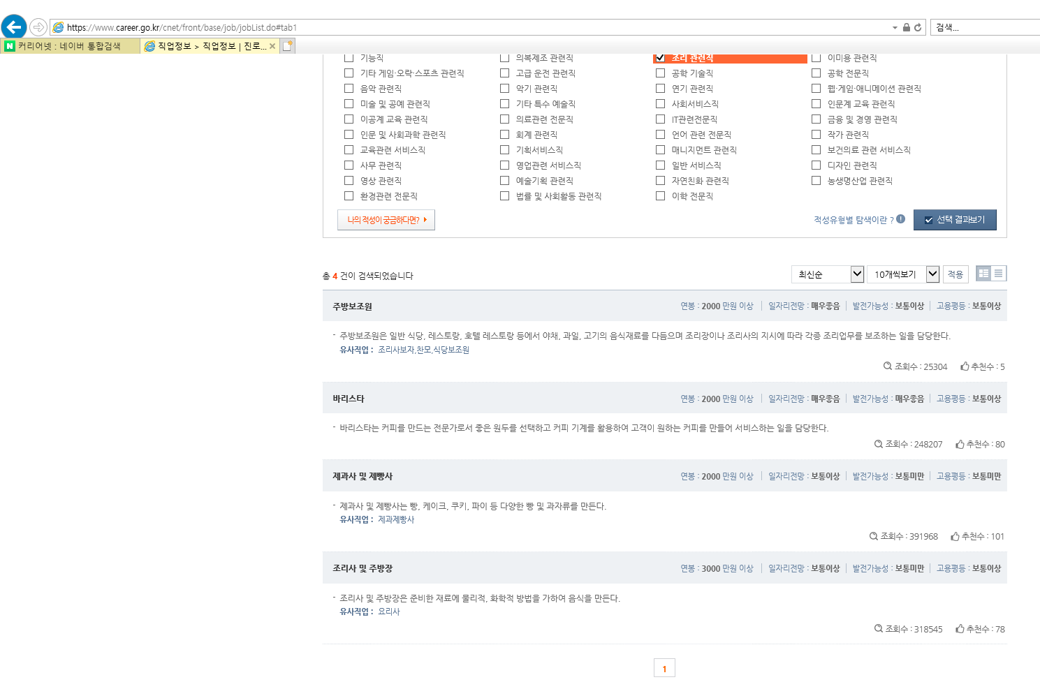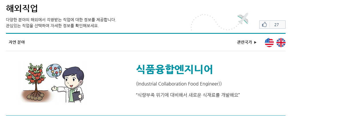커리어넷에서 직업정보에 들어가 조리 관련직을 눌렀을 때 나오는 결과입니다. 직업전망이 보통 이상입니다. 특히 바리스타는 매우 좋음으로 뜹니다. 요즈음에는 카페에서도 한 끼 식사를 대체할 수 있는 브런치, 디저트 등을 접목할 수도 있으므로 커피, 음료도 좋아하고 간단한 음식 만드는 것도 좋아하신다면 바리스타 자격증을 따서 카페를 차리는 것도 좋겠습니다. 그러나 아시다시피 한국은 카페 과포화 시대이므로 입지, 콘셉트, 메뉴 차별화, 맛 등이 매우 중요하겠습니다. 그런데도 커리어넷에서 전망 좋음으로 뜬 것이 흥미롭습니다. 아래는 커리어넷 홈페이지에서 해외 직업군에 나오는 직업인데 이것을 가져온 이유는 미래에는 환경오염으로 식량부족 우려의 목소리도 있어 탐구하고 연구하는 것을 좋아하는 분들이라면 요리연구가도 좋지만, 식품융합 엔지니어를 직업으로 삼으셔도 좋을 것 같다는 생각에 가져와봤습니다. 자세한 내용은 커리어넷에서 확인 가능합니다.