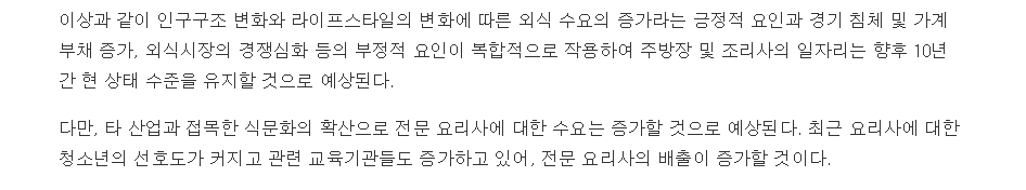 결론부터 얘기하자면 yes입니다. 어떻게 확신할 수 있는가? 뉴스 기사를 보면서 이야기를 드리려고 했는데 많이 찾아보기가 어려웠습니다. 그래도 찾아보면서 느낀 점은 요리사를 제대로 대체할게 없다는 것입니다. 물론 이미 5-6년 어쩌면 그 이전부터도 요리하는 로봇, 미래 식량에 대한 연구는 많이 있어져 왔으나 아직까지는 식당에 로봇이 보편적으로 쓰인다던가, 미래 식량으로 요리하여 판매한다던가 하는 것은 아직까지 흔하게 보지 못하셨을 겁니다. 심지어 세종대학교 미래교육원에는 요리과정이 있습니다. 되려 10년 후 증가하게 될 직업 중에 요리사가 있다는 것도 흥미로운 사실입니다. 찾은 자료를 첨부하여 이야기를 이어나가겠습니다.